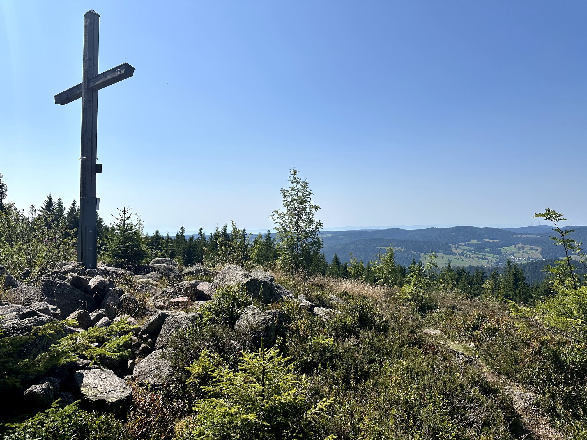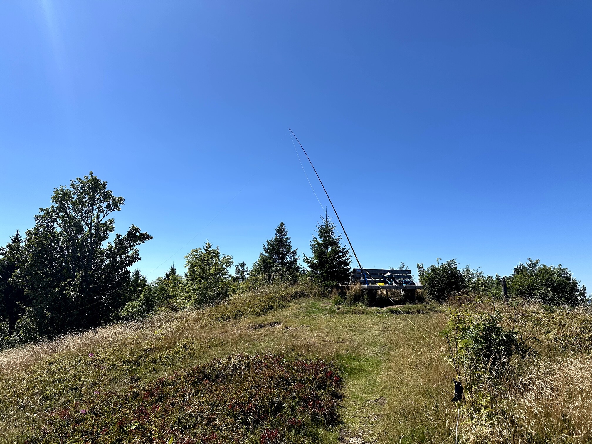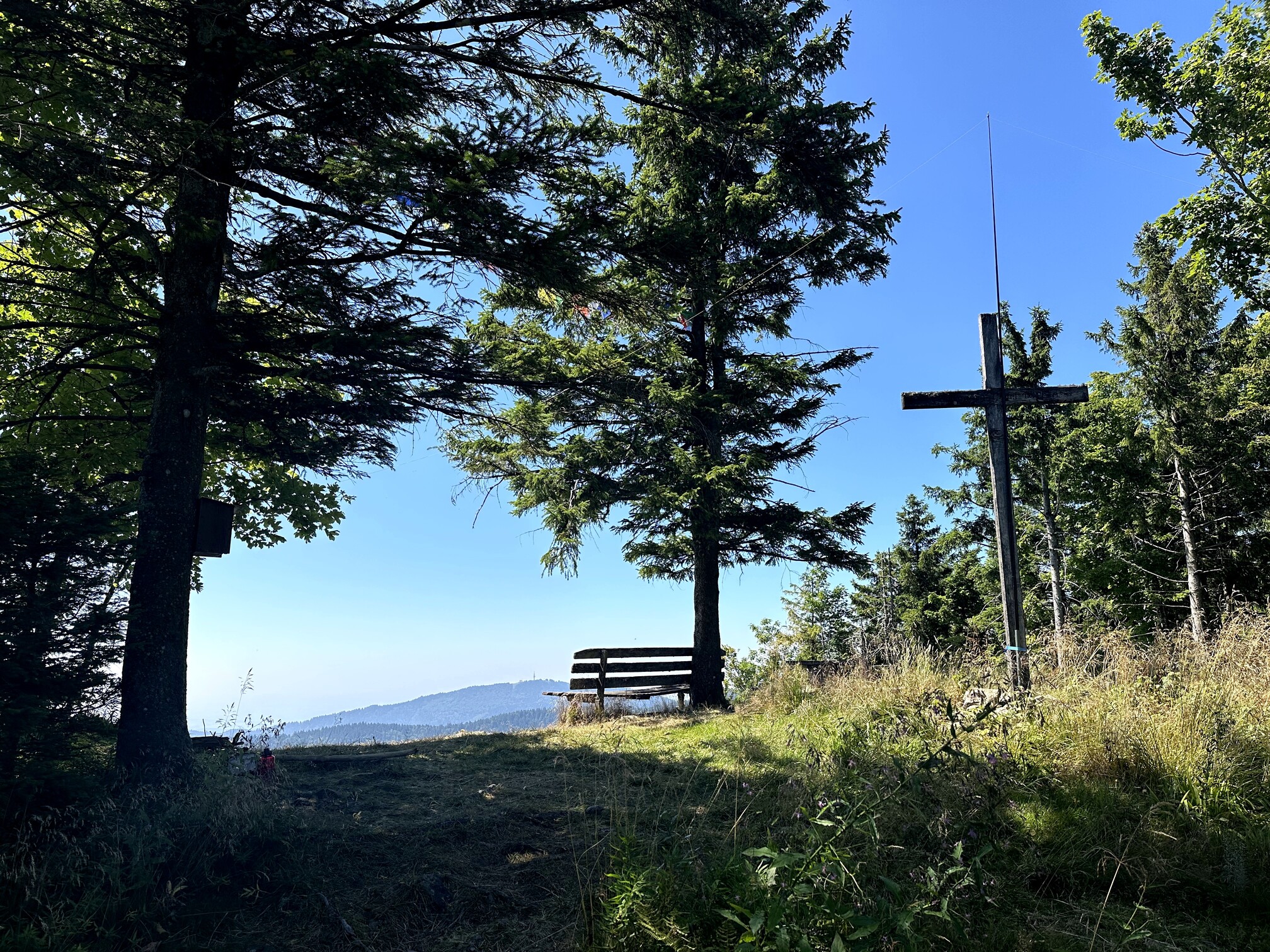 I hiked to the southernmost peak of Köhlgarten, which boasts both a summit cross and the finer views, compared to the eastern summit. Unfortunately, visibility was affected by forest fire smoke; normally, the Swiss Alps are visible here. Nevertheless, I enjoyed the spot, setting up my mast at the cross and sitting in the shade. There was a bench with a stellar southern view, but it was in direct sunlight—unbearable in the summer heat.