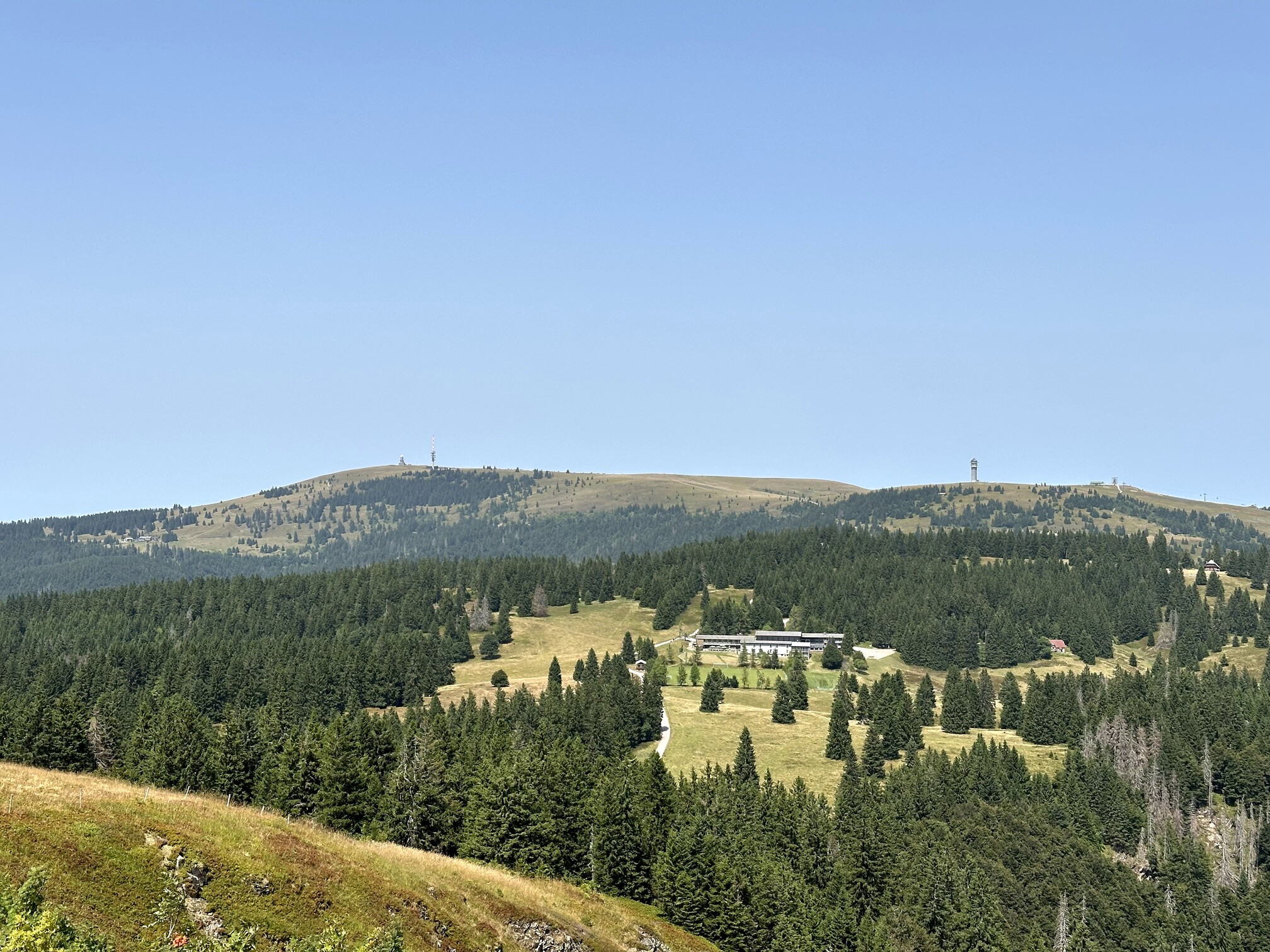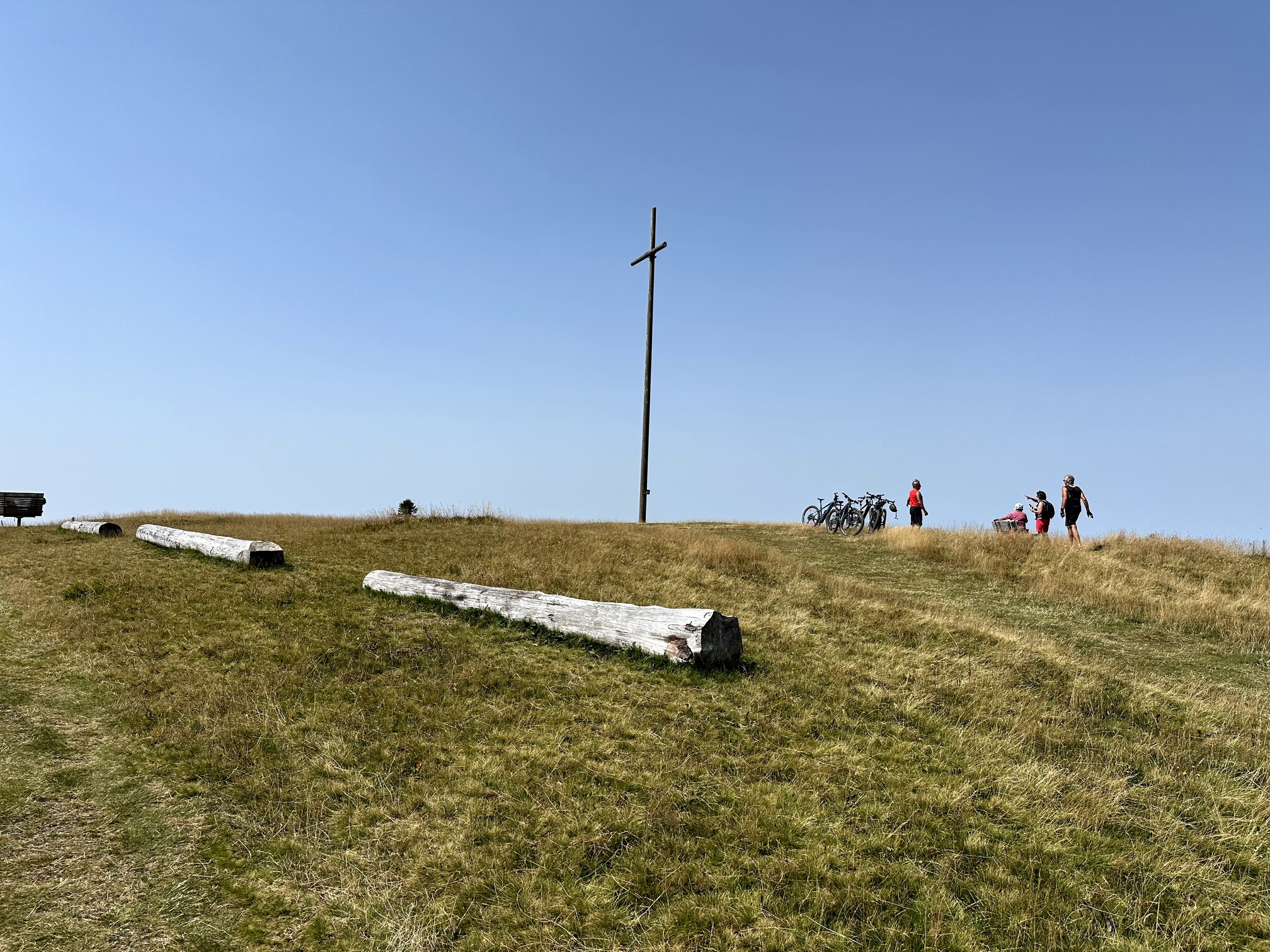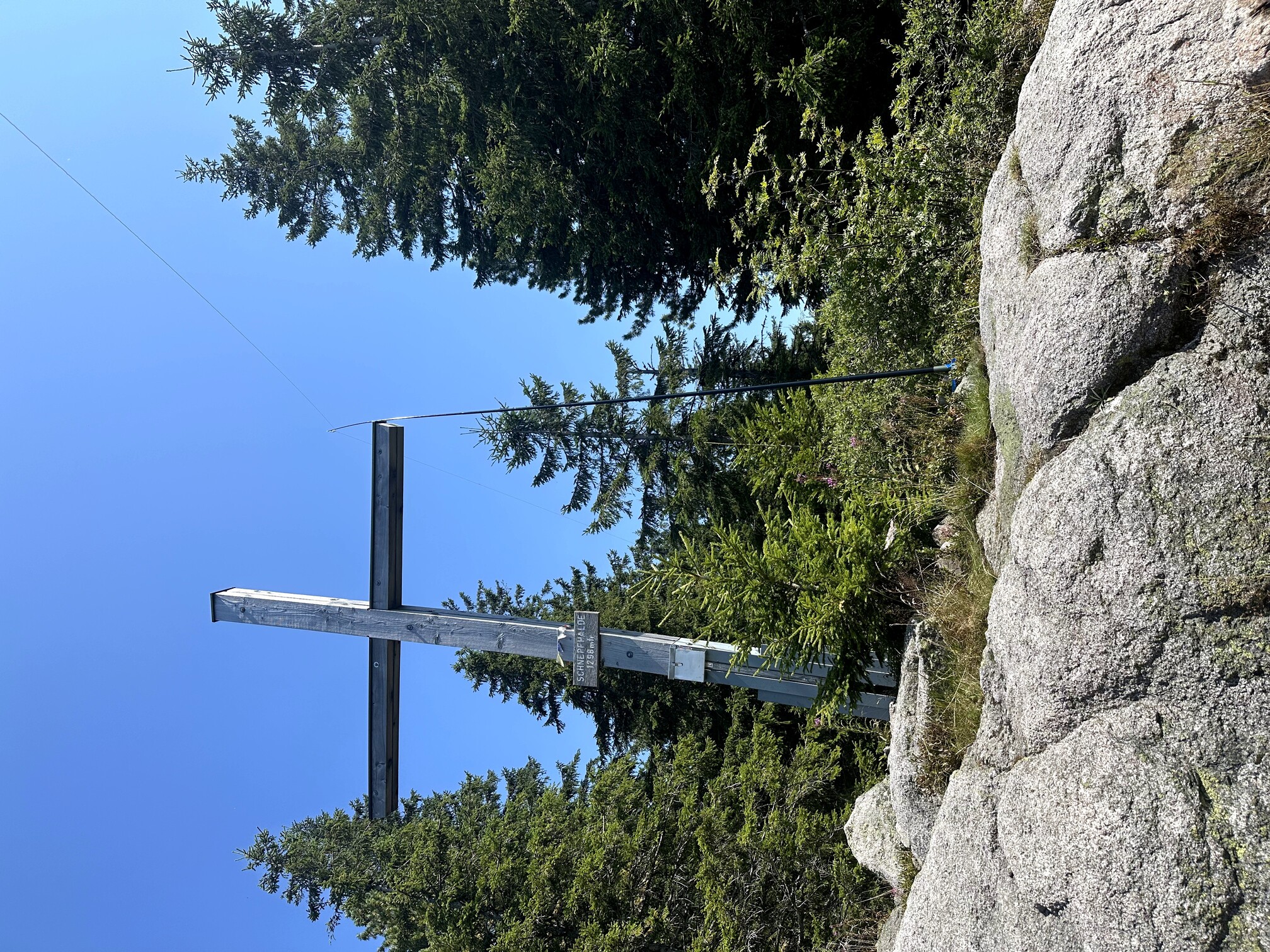 I hiked to the southernmost peak of Köhlgarten, which boasts both a summit cross and the finer views, compared to the eastern summit. Unfortunately, visibility was affected by forest fire smoke; normally, the Swiss Alps are visible here. Nevertheless, I enjoyed the spot, setting up my mast at the cross and sitting in the shade. There was a bench with a stellar southern view, but it was in direct sunlight—unbearable in the summer heat.