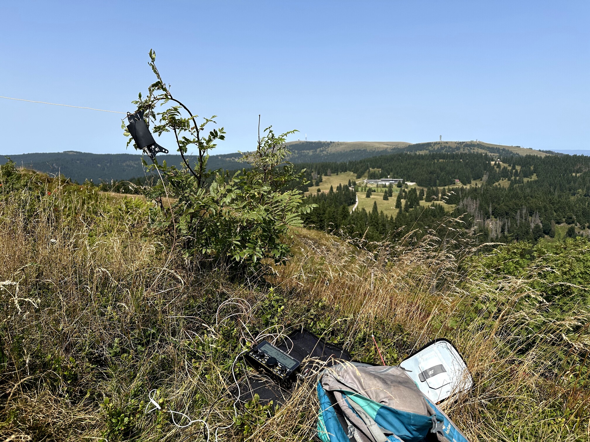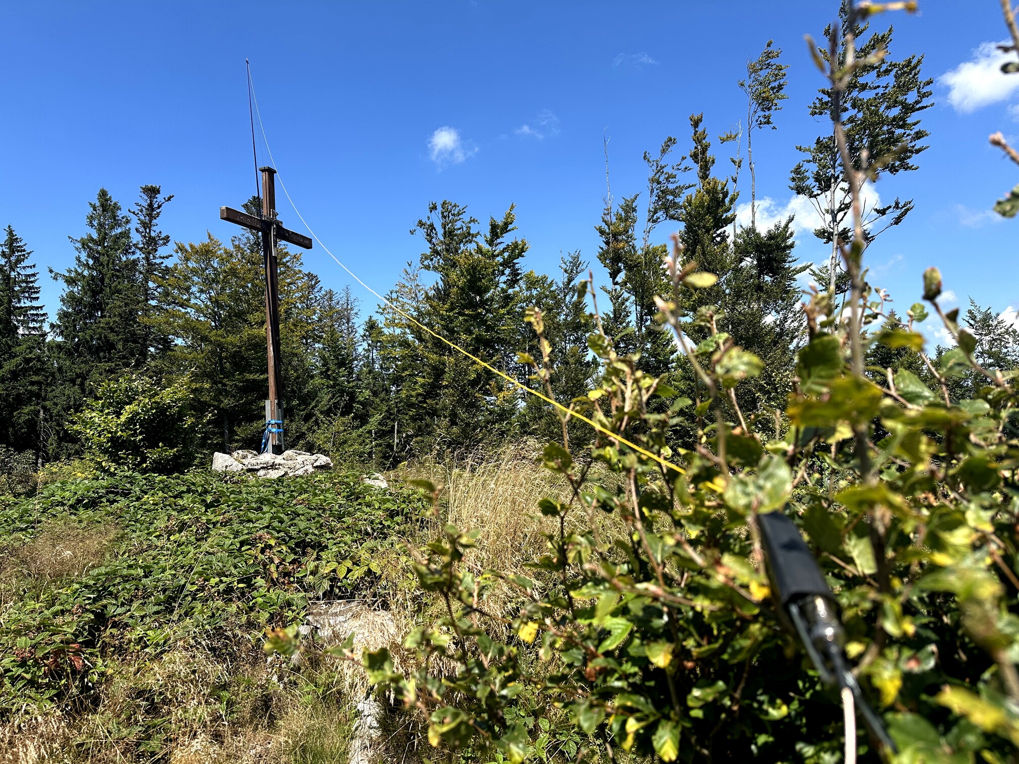 At the summit, I found not only a cross and a small cabin but also a convenient bench just above the cross, which served perfectly as my operating spot. Here, I set up my EFHW antenna and enjoyed sweeping views of the major Black Forest summits and even glimpses of the Swiss Alps.