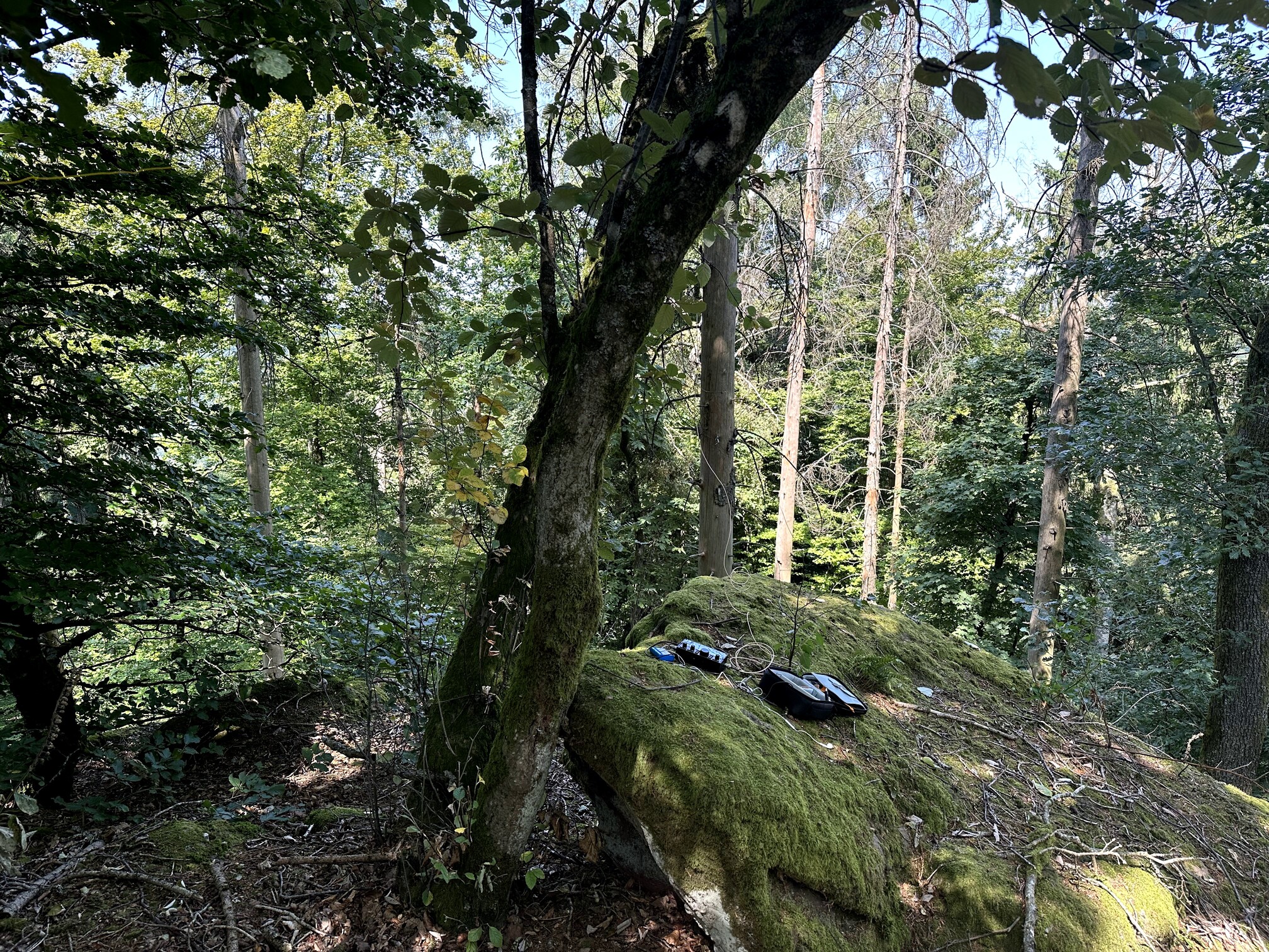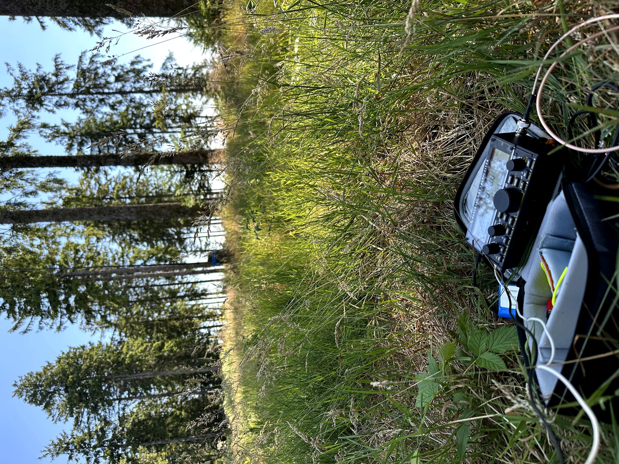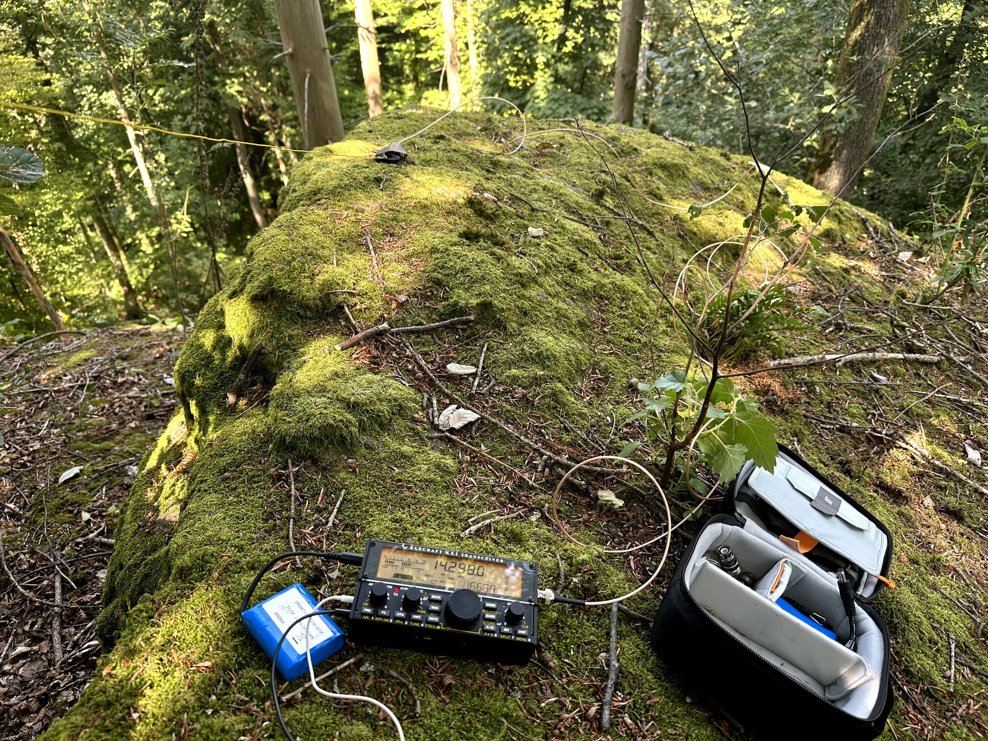 The Hochgescheid summit is more of a plateau, offering limited views—the surrounding trees obscure most of it. I found a pleasant spot beside the forest road, with raspberries growing nearby. Solar conditions were expected to deteriorate due to a pending CME, yet band conditions stayed favorable, and I managed 35 QSOs in 1 hour and 15 minutes (17 on 40 m, 18 on 20 m).